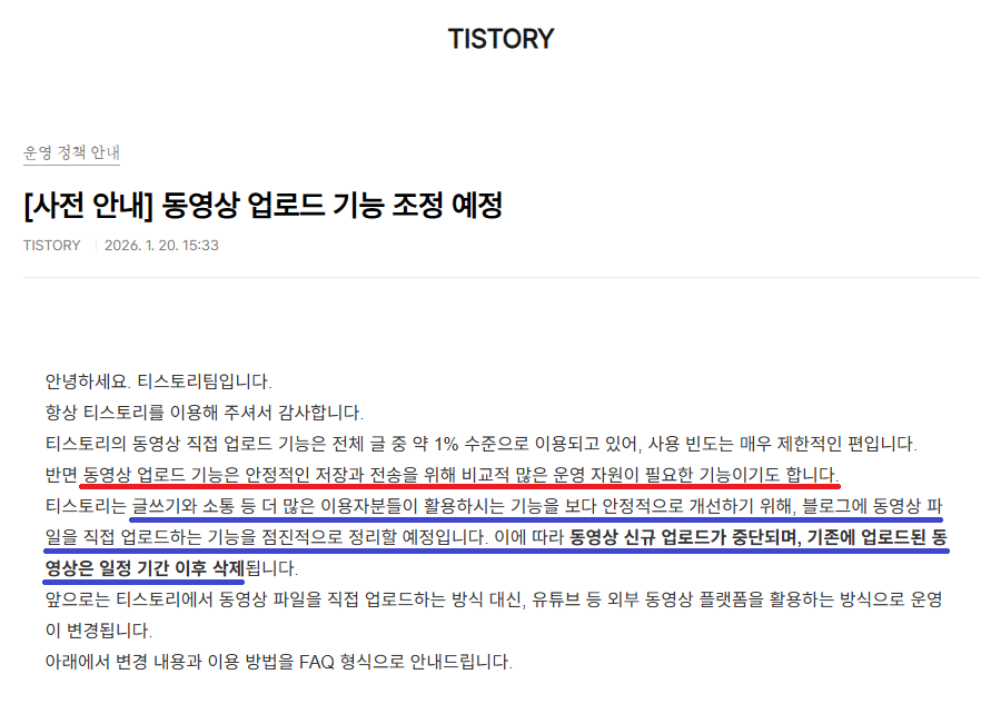 블로그 동영상 파일 업로드기능을 정리할예정이고 신규 업로드는 중지.